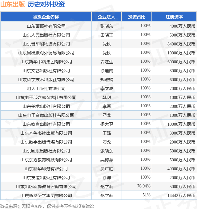 本站消息,根据天眼查APP显示,山东出版(601019.SH)新增一起对外投资事件国尚策略,被投资公司为山东新华研学集团有限公司,法定代表人赵学莉,投资占比为51%。该公司从事文化艺术业国尚策略,注册资本为14442万人民币。目前,山东出版共存在对外投资23项,投资占比前20的项目见下表: