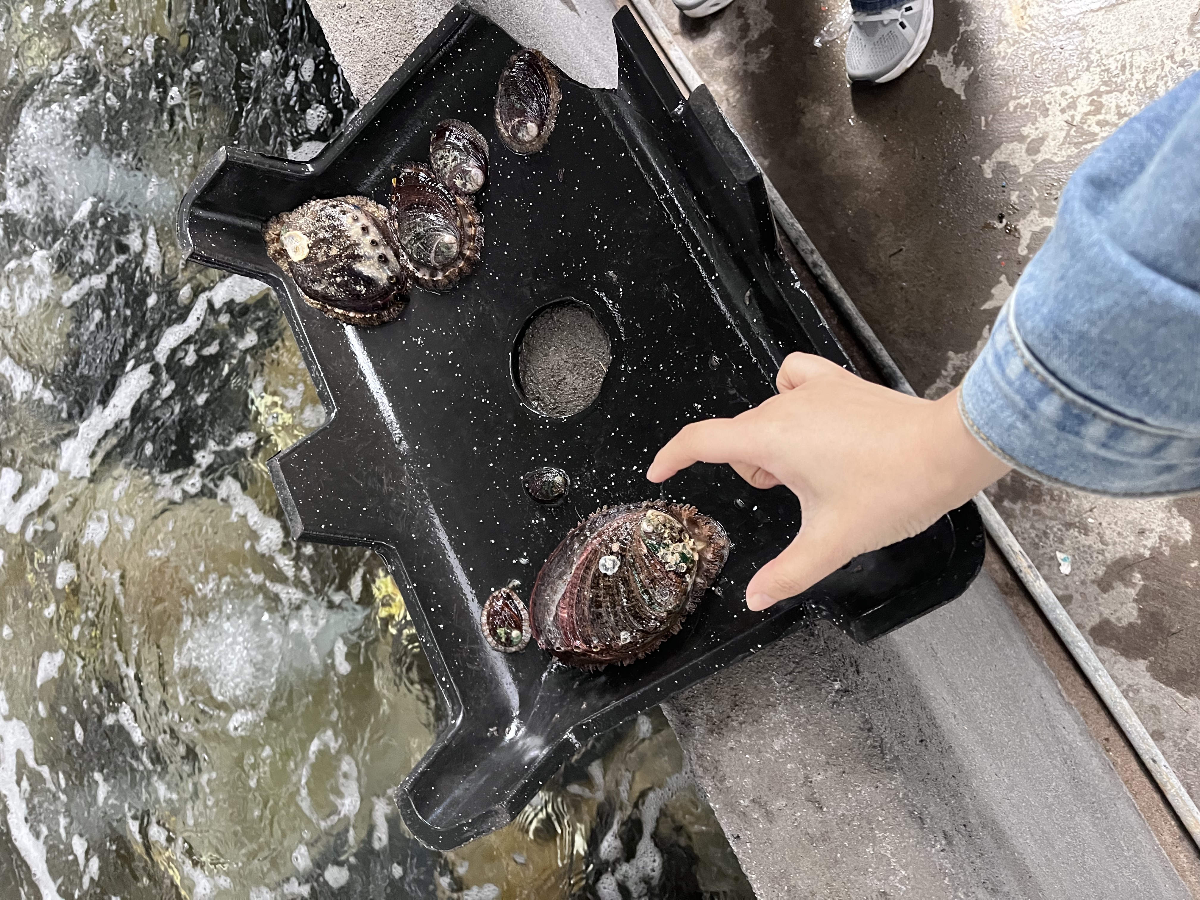 养殖基地外的风浪、养殖基地的鲍鱼。李菲摄