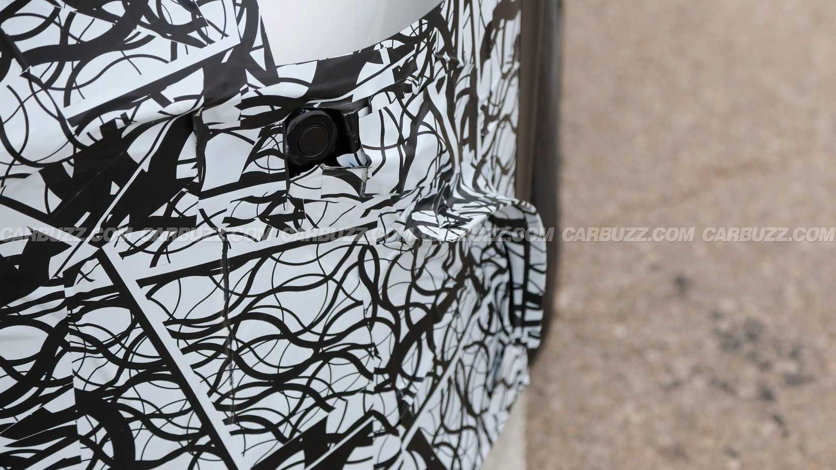 外观方面,GLC 53 采用了比普通版更为激进的空气动力学套件。车头部分,伪装贴纸下隐约可见更大的下分流器与扩大的进气口,前保险杠两侧也新增了气动装置。